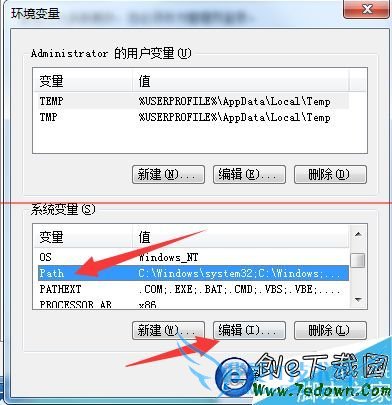 6、在系统变量栏目下方找到【path】变量,鼠标点击选中,然后点击下方的编辑工具。