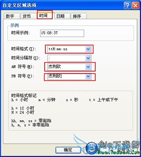 “选项”-----“自定义”----“时间”----时间格式(T)里的H:mm:ss前加两个 tt,ttH:mm:ss ,如果你想让你喜欢的名字在时间的后面显示 ,你可以把tt打在后面,H:mm:sstt。然后在AM符号(M):里填上你喜欢的名字,在PM符号(P):里也填上你喜欢的名字。