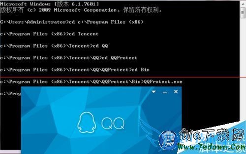 最后一步:紧接着上步从键盘输入该应用文件的名称.exe即可。以QQ为例,输入QQProtect.exe,接着稍等片刻,QQ软件就打开了。(注意:最后一步不用输入cd)