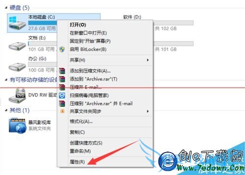 1、打开桌面“计算机”, 进入磁盘界面右键点击C盘,选择属性选项