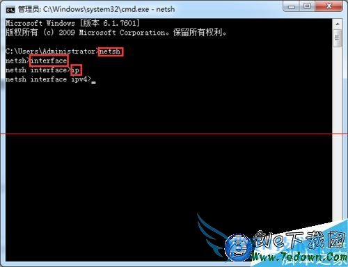 2、在命令提示符中依次输入"netsh"--->"interface"--->"ip",并依次回车。