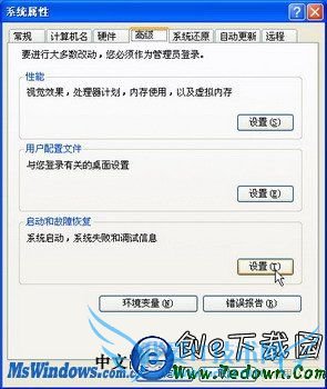 第2步,打开“系统属性”对话框,切换到“高级”选项卡。在“启动和故障恢复”区域单击“设置”按钮,如图所示。单击“设置”按钮