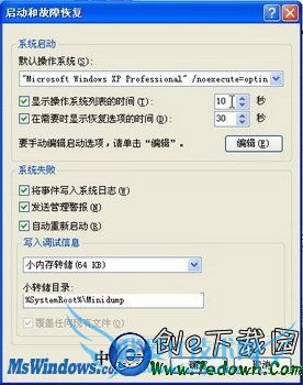 第3步,打开“启动和故障恢复”对话框,调整“显示操作系统列表的时间”微调框的数值(如“10”),从而修改多重引导菜单的显示时间。设置完毕单击“确定”按钮。返回“系统属性”对话框后再次单击“确定”按钮即可,如图所示。 “启动和故障恢复”对话框