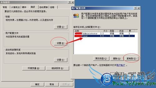 三、还有种方法就是右键我的电脑--属性--高级--用户配置文件--将用户复制到你原来文件夹中去。但是这种方法存在一定风险,因为会覆盖掉原来文件夹,导致文件丢失。而且这种方法还存在一个比较大问题是,你覆盖掉文件,但是注册表依然存在引用问题,还会出错。这个我尝试过,不能解决问题。