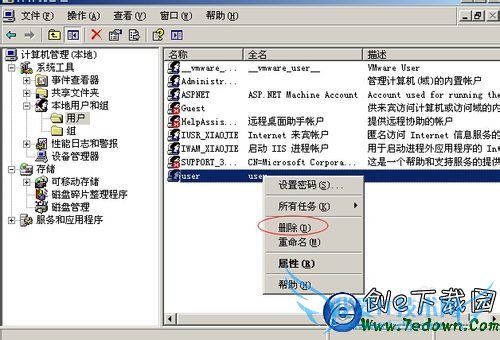 二、右键我的电脑--管理--本地用户和组--右键登录用户--删除。删除用户可能导致原有软件因权限不够而用不了,这样你可以建立管理员用户。这样就不会出权限不足而使用不了。
