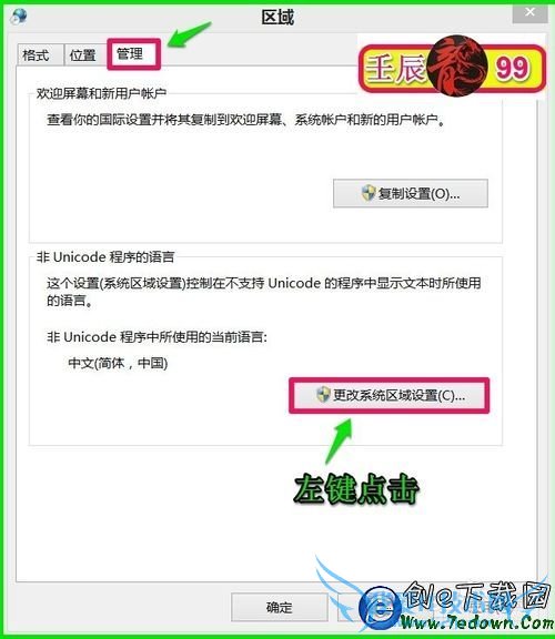 在区域对话窗口,我们点击:管理,在管理标签下的非Unicode 程序的语言项左键点击:更改系统区域设置(C)...;