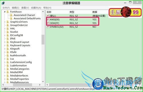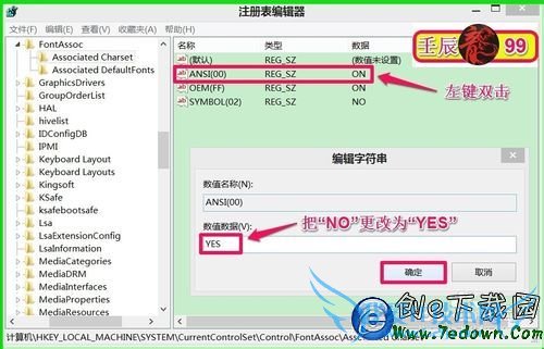 在Associated Charset对应的右侧窗口找到:ANSI(00),左键双击:ANSI(00),弹出编辑字符串窗口,在数值数据(V)栏把“NO”更改为“YES”,再点击:确定;