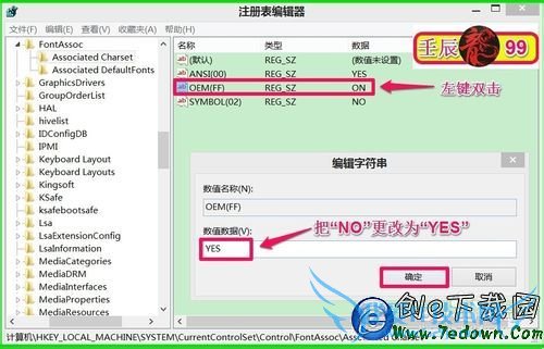 在Associated Charset对应的右侧窗口找到:OEM(FF),左键双击:OEM(FF),弹出编辑字符串窗口,在数值数据(V)栏把“NO”更改为“YES”,再点击:确定;