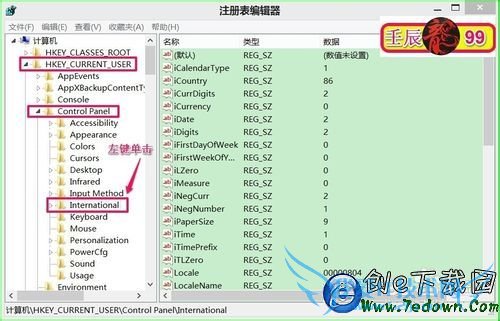 注册表路径:HKEY_CURRENT_USER]\Control Panel\ International,打开注册表编辑器,展开:HKEY_CURRENT_USER]\Control Panel,在Control Panel展开项中找到:International并左键单击:International;