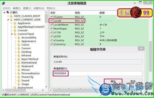 在International对应的右侧窗口找到Locale,左键双击Locale,弹出编辑字符串窗口,修改数值数据栏(V)中的数据,如果是中文简体,我们把Locale的键值修改成"00000804",再点击:确定;
