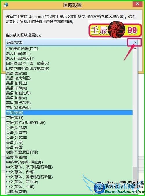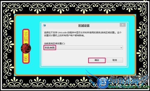 在区域设置窗口,点击当前系统区域设置(C)栏的小勾,选择:英语,再点击确定,重新启动计算机;