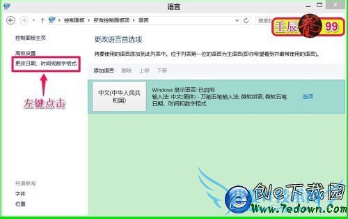 打开控制面板 - 语言,在打开的语言窗口,左键点击:更改日期、时间或数字格式,打开区域对话窗口;