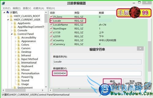 如果是中文繁体:我们把Locale的键值修改成"00000404",再点击:确定;