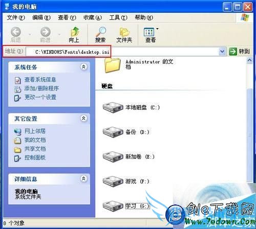 1、首先进入“我的电脑”地址栏输入“C:\WINDOWS\Fonts\desktop.ini”。
