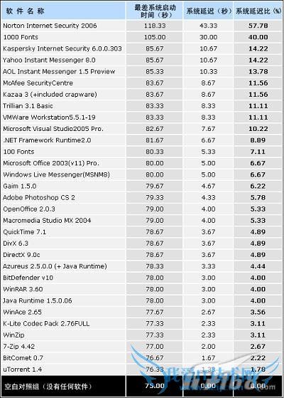 在检验系统性能的工具上,我选择了微软官方的Microsoft BootVis软件。该软件能够准确地测试出操作系统的每一个组件所花费的加载时间,以便于用户可以知道该删除哪些不需要的组件,或是禁止哪些花费时间太长的东西。利用这个软件,我可以测试出在每种情况下系统启动所花费的时间。再用每一个时间减去空白系统启动所花费的时间,就可以得出每个软件所增加的系统启动时间,进而可以得出每种软件的延迟百分比。