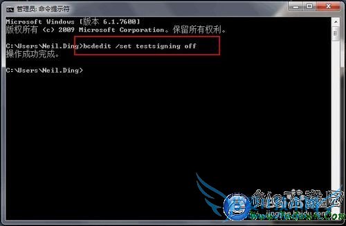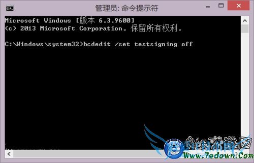 打开命令提示符后输入“bcdedit /set testsigning off”(不含引号),输入后回车,提示操作完成后重启,如下图Win8/8.1及Win7: