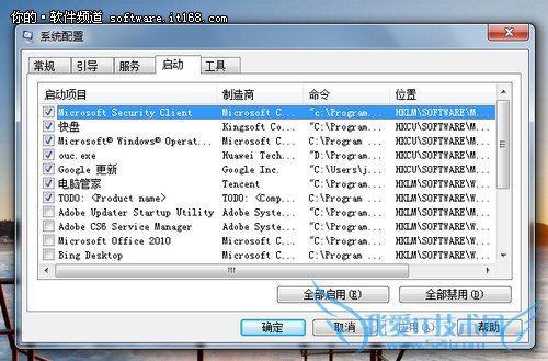 很多同学入手了Win7新电脑,自然是每天把玩,乐不自禁,也许几天时间里就已经安装了大量的程序,毕竟现在的机子,内存和硬盘空间都很大,恨不能把所有的程序、游戏都安装上去玩个爽。刚开始时,可能你的电脑运行速度还很快,但使用一段时间后,是不是发现电脑的启动时间,以及开启程序的时间变得越来越长了?有木有!其实,不是电脑的硬件不够高,可能是你的系统已经变得越来越臃肿了!那么,是什么在“吃”掉你的空间和速度?通过本文,给你的电脑做个体检,相信你可以让Win7跑的更快。 首先,开机启动项过多往往是影响开机速度的罪魁祸首,并且很多情况下,用户并不知道哪些是开机启动项,并且部分软件是默认开机启动,除非单独进行设置才行。除此之外,开机启动项中必然包括系统的必要内容,比如桌面、任务栏等。而安装的软件,有一些例如杀毒软件自动启动也就无所谓了,有一些软件不常用,并且完全没必要开机启动