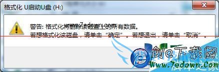 4、随即弹出警告提示执行此任务会删除u盘上所有文件数据。由于开始的时候我们就备份好u盘文件数据,所以点击“确定”按钮,确认执行
