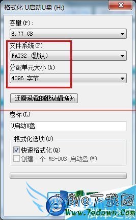 2、此时会弹出格式化u盘窗口,其中我们可以看到文件系统(FAT32)和分配单元大小(4096字节)
