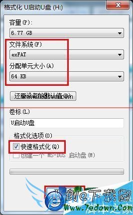 3、把它们分别都设置为exFAT和64KB,并勾选“快速格式化”,再点击“开始”按钮