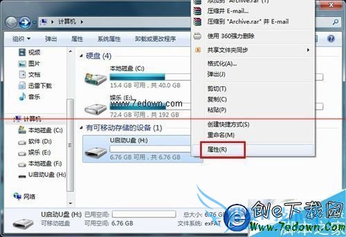 6、返回计算机主窗口,右键单击u盘图标,在弹出的选项中点击“属性”项