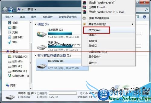 1、把u盘插入电脑usb接口上,然后打开计算机主窗口,右键单击u盘图标,在弹出的选项中点击“格式化”项