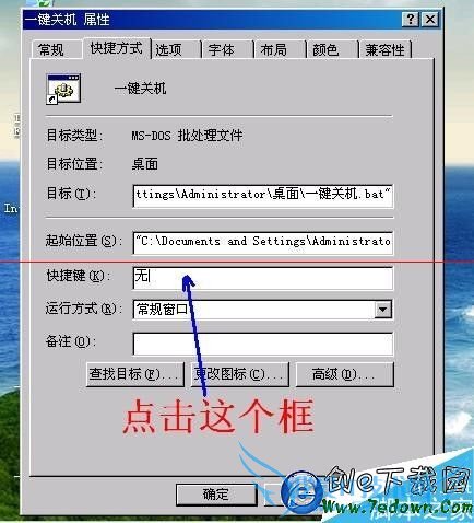 3、弹出属性窗口,在“快捷键”选择框中点击鼠标左键。