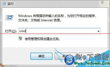 2、在“运行”程序中输入“cmd”。并敲击“回车”。如图: