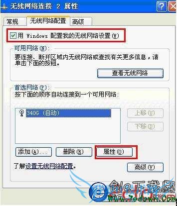 3. 在“无线网络配置”中”首选网络”选择所要连接的网络,点击“属性”。