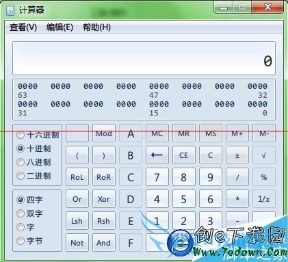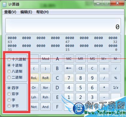 打开程序员型计算器,可以看到进制转换菜单。其中包括,十进制、八进制、16进制、2进制。而且可以设置字节。