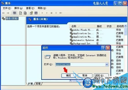 1、开始→运行→输入:services.msc 点击确定(或按回车键)打开服务。