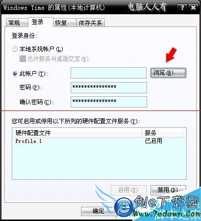 5、Windows Time服务属性→登录→此账户→将当前的账户涵盖进去。