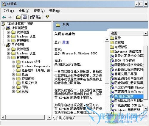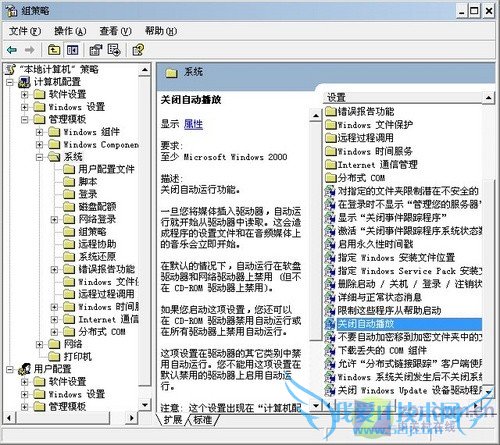 3.用户配置中禁用“自动播放”功能 在“开始”→“运行”中输入“gpedit.msc”,打开“组策略”窗口,在“用户配置”→“管理模板”→“系统”栏中,双击“关闭自动播放”项,将其设为“已启用→所有驱动器”。禁用“自动播放”功能。