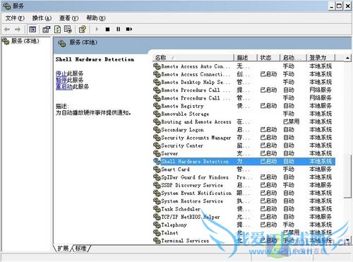 点击“开始”→“控制面板”→“管理工具”项打开“服务”窗口,找到并双击“Shell Hardware Detection”服务,将其设为“禁用”,可关闭“自动播放服务”。