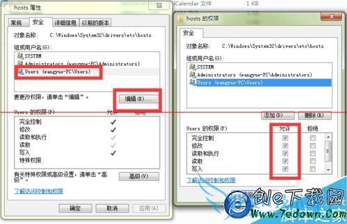 2、在hosts文件上右键-->属性,选择安全标签页,选中Users,单击编辑,在弹出的对话框里将User的权限勾选为完全控制。点击确定结束。
