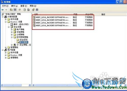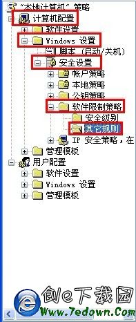 3、在左侧的控制台树窗口依次展开“计算机配置——Windows 设置——安全设置——软件限制策略——其他规则”
