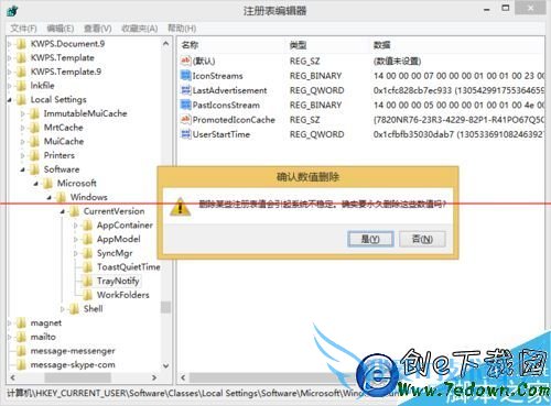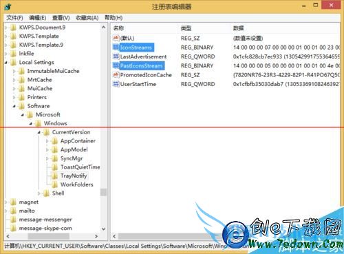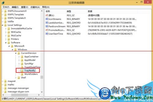 2、进入“注册表编辑器”,在这里我们从左侧栏中依次打开HKEY_CURRENT_USER\Software\Classes\Local Settings\Software\Microsoft\Windows\CurrentVersion\TrayNotify目录