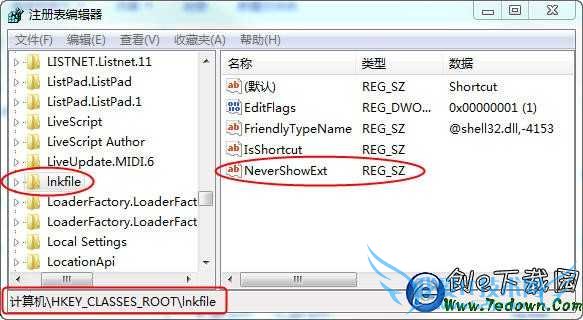 ② 找到HKEY_CLASS_ROOT/lnkfile项,新建一个字符串值,名为“NeverShowExt”,数据为空,不用填;