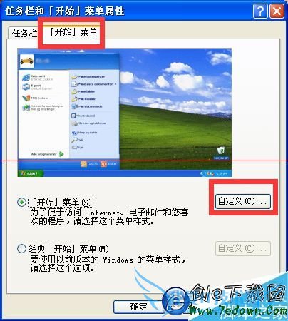 2、【任务栏和[开始]菜单 属性】的窗口,选择[开始]菜单这一项。