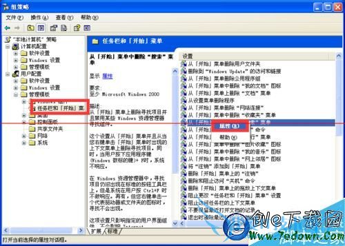 8、在”任务栏和[开始]菜单“里找到从[开始]菜单中删除“搜索”菜单,然后鼠标右键点击”属性“。