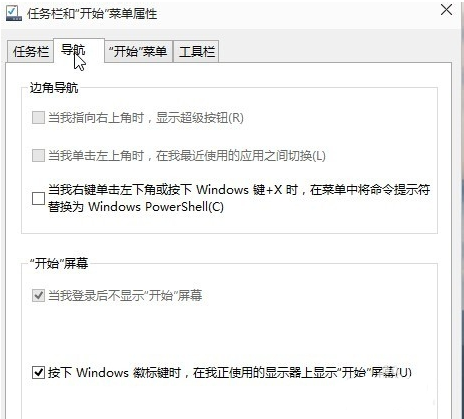 果不其然在这里,但开始菜单里没发现什么异常,倒是<导航>菜单里发现有个缺省的选择<当我登录后不显示开始菜单>而且不可更改,估计是平安战略上的问题。