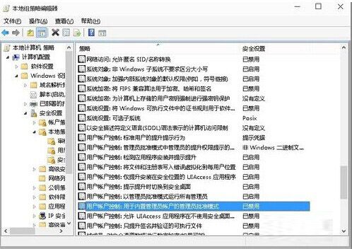 依次选择-<平安设置>-<外地战略>-<平安设置>,将右边的用户账户控制:用于内置管理员账户的管理员批准模式设置为启用,重启win10