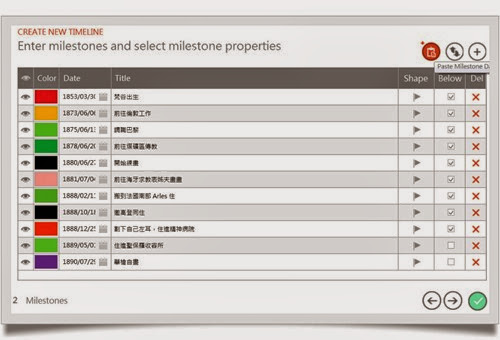 我用之前研究梵谷生平的数据示范给他看,按右下角打勾按键,来看成品。不喜欢 Metro 样版,在上方功能键找 Change,替换别的样式。时间表完成可 Email 图片格式给其他人看。