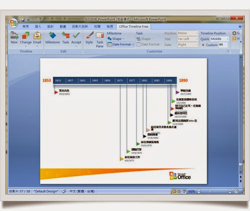 Office Timeline 是一个加装于 Powerpoint 的工具,适用于Microsoft PowerPoint 2007/ 2010/ 2013,‘免费’从网站下载,解压缩执行程序安装后,PowerPoint 上方工具栏出现 Office Timeline Free 的页面。