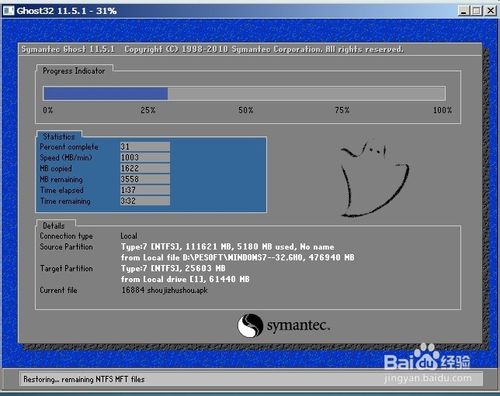 4、然后开始进行安装,如下图,稍等一会,等进度条走完,计算机会自动进行重启