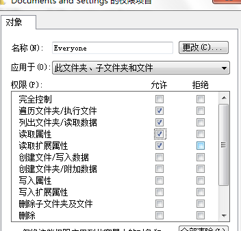 点击后会跳出一个权限对象对话框,这时把拒绝项上的"√"删除即可了。
