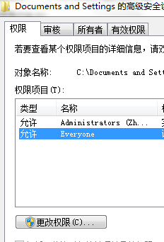 高级对话框会后,选择“权限”,选择everyone,没有的话可以创建一个,之后选择“更改权限”,