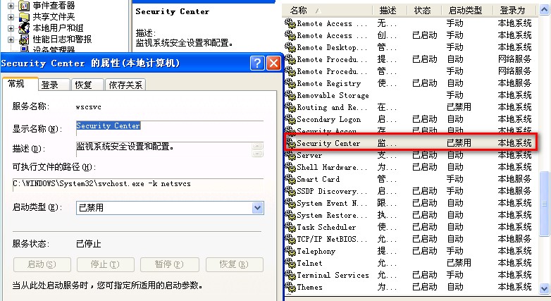 答: 解决方案: 1、进入“控制面板”,双击“安全中心”; 2. 点击窗口左侧的更改“安全中心”通知我的方式; 3. 将防火墙、自动更新和病毒保护前的勾去掉,重启故障解决。 若第二步中,更改“安全中心”通知我的方式]为灰色无法选中,如图 此情况为禁用了Secu... >>详细