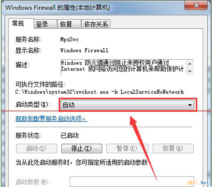 4、在属性窗口中,点击“启动”,并且将启动设置为自动启动。