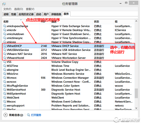 步骤一完成后,打开任务管理器,找到服务项,选择按名称排序,将框中四项全部停止运行。